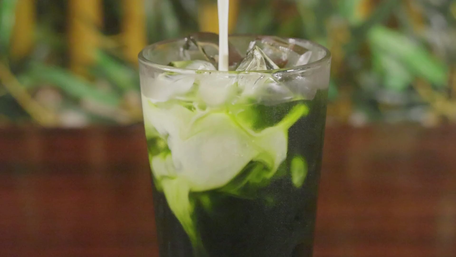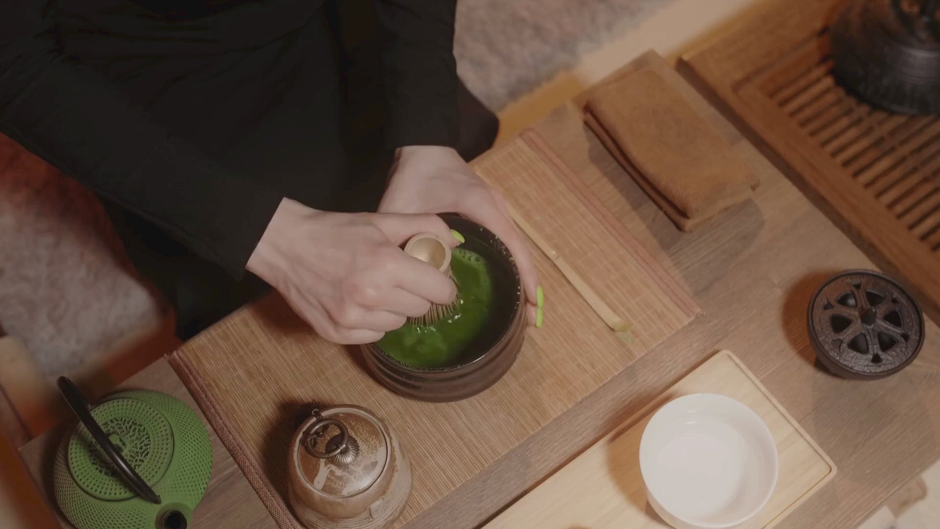 Fouettez énergiquement avec le fouet chasen en formant un “M", reflet d’un geste ancestral, jusqu’à créer une mousse dense, et d’un vert éclatant.